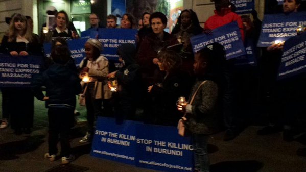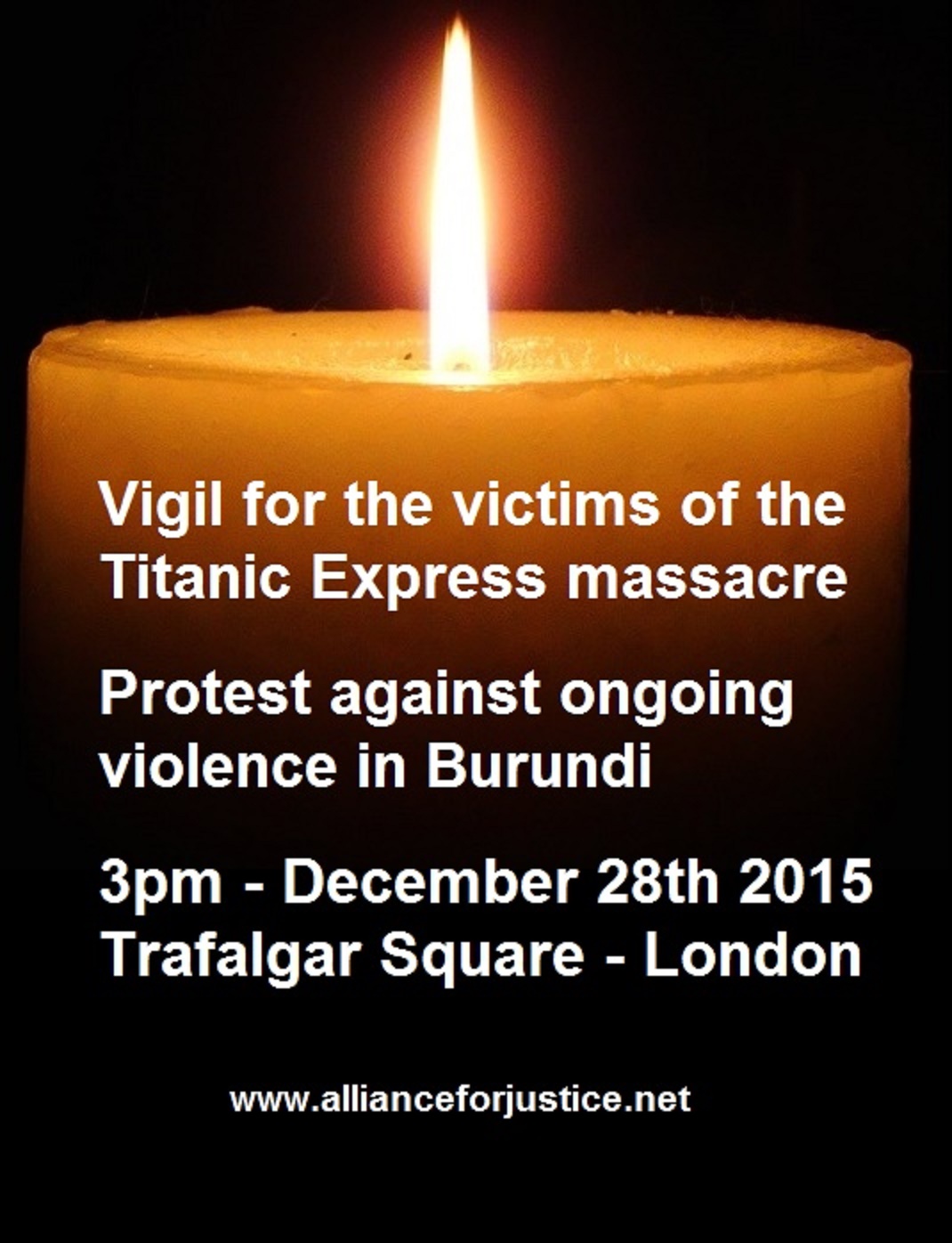 On December 28th 2015, the Alliance for Justice will mark the 15th anniversary of the Titanic Express massacre with a candlelit vigil close to the Burundian Embassy in Trafalgar Square, London. We will also be protesting against the ongoing violence which continues to claim lives today. Please join us if you can, and share with any others who might be able to attend: